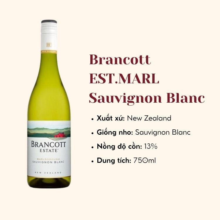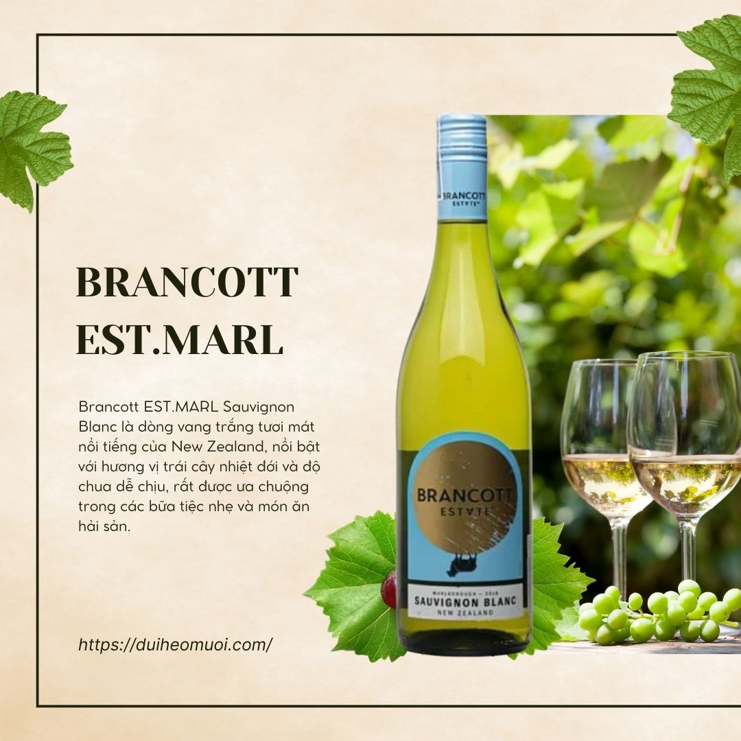 Brancott EST.MARL Sauvignon Blanc là chai vang trắng nổi tiếng đến từ New Zealand, cụ thể là vùng Marlborough – nơi được biết đến là vùng trồng nho hàng đầu của nước này. Cái tên “Brancott” là tên của điền trang Brancott Estate – nơi sản xuất chai vang này, còn “EST.MARL” có nghĩa là rượu được làm tại Marlborough.