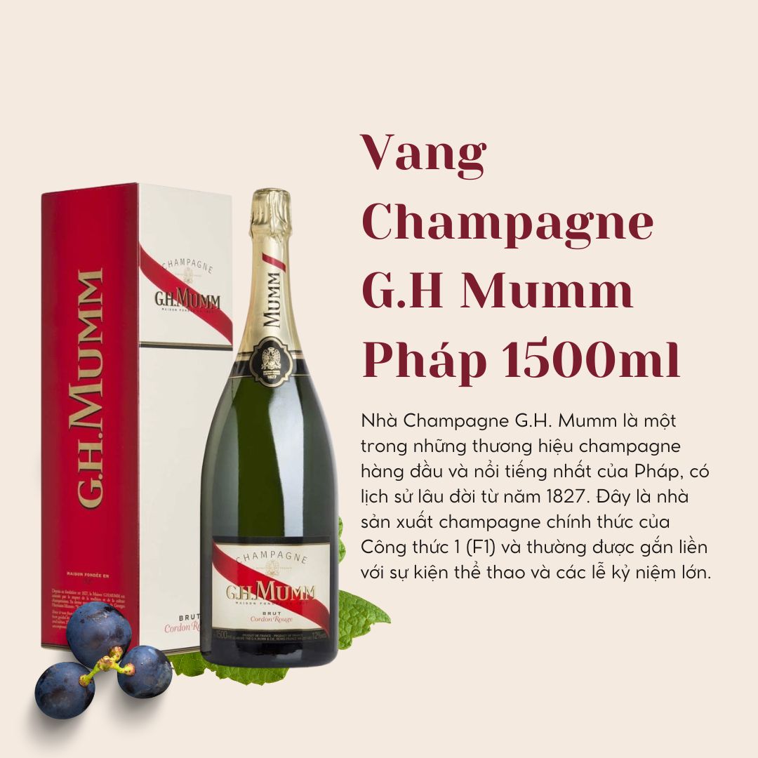Với gần 200 năm kinh nghiệm, GH Mumm không chỉ là một thương hiệu, mà còn là đại diện cho rượu champagne cao cấp với chất lượng vượt trội và phong cách đầy tinh tế.