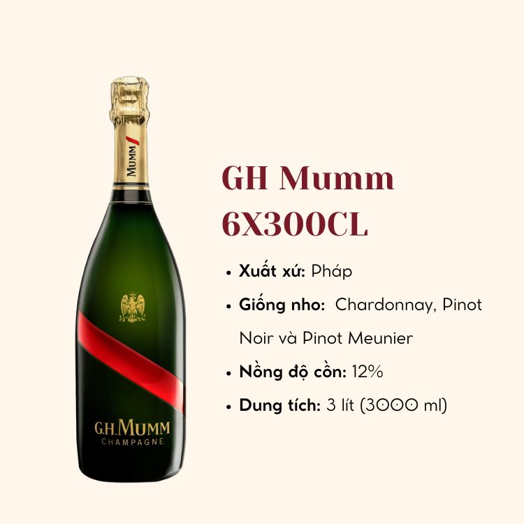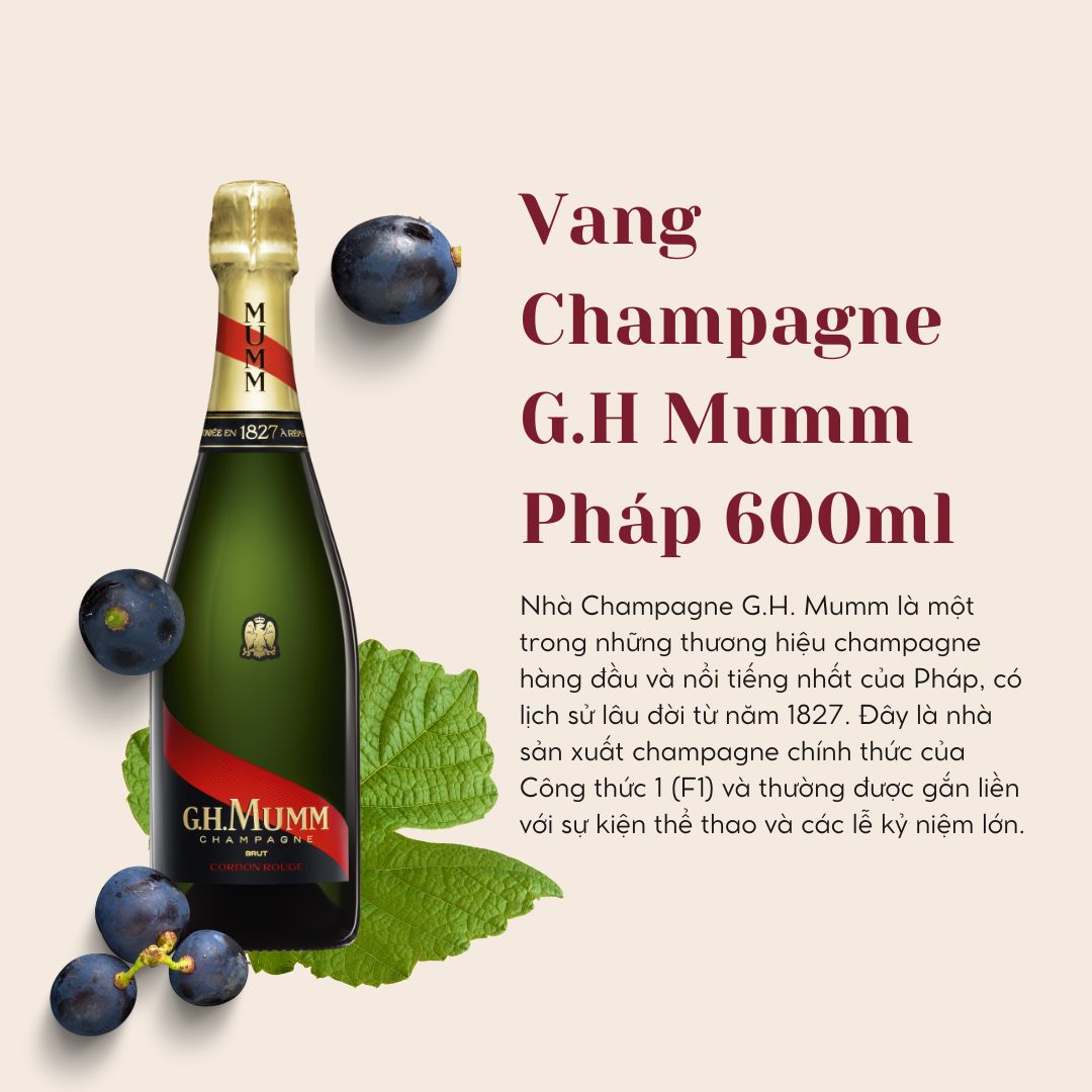 Với gần 200 năm kinh nghiệm, GH Mumm không chỉ là một thương hiệu, mà còn là đại diện cho rượu champagne cao cấp với chất lượng vượt trội và phong cách đầy tinh tế.