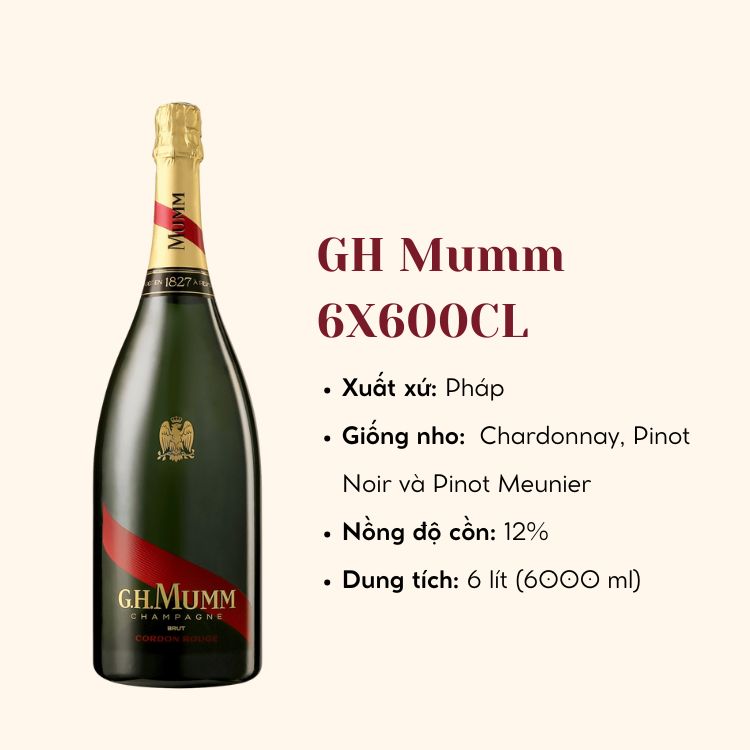 Với gần 200 năm kinh nghiệm, GH Mumm không chỉ là một thương hiệu, mà còn là đại diện cho rượu champagne cao cấp với chất lượng vượt trội và phong cách đầy tinh tế.