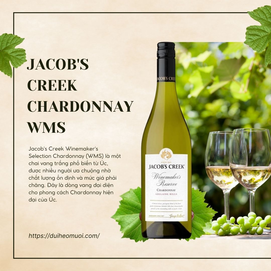 Winemaker’s Selection, gọi tắt là WMS, là dòng rượu được tạo ra từ sự chọn lọc kỹ càng của các nghệ nhân làm rượu tại Jacob’s Creek. Riêng với dòng jacob creek chardonnay, họ lựa chọn những trái nho Chardonnay chín mọng nhất, rồi xử lý bằng công nghệ hiện đại kết hợp một phần ủ gỗ sồi để giữ lại hương thơm tự nhiên mà vẫn có chiều sâu và độ mềm mại khi thưởng thức.