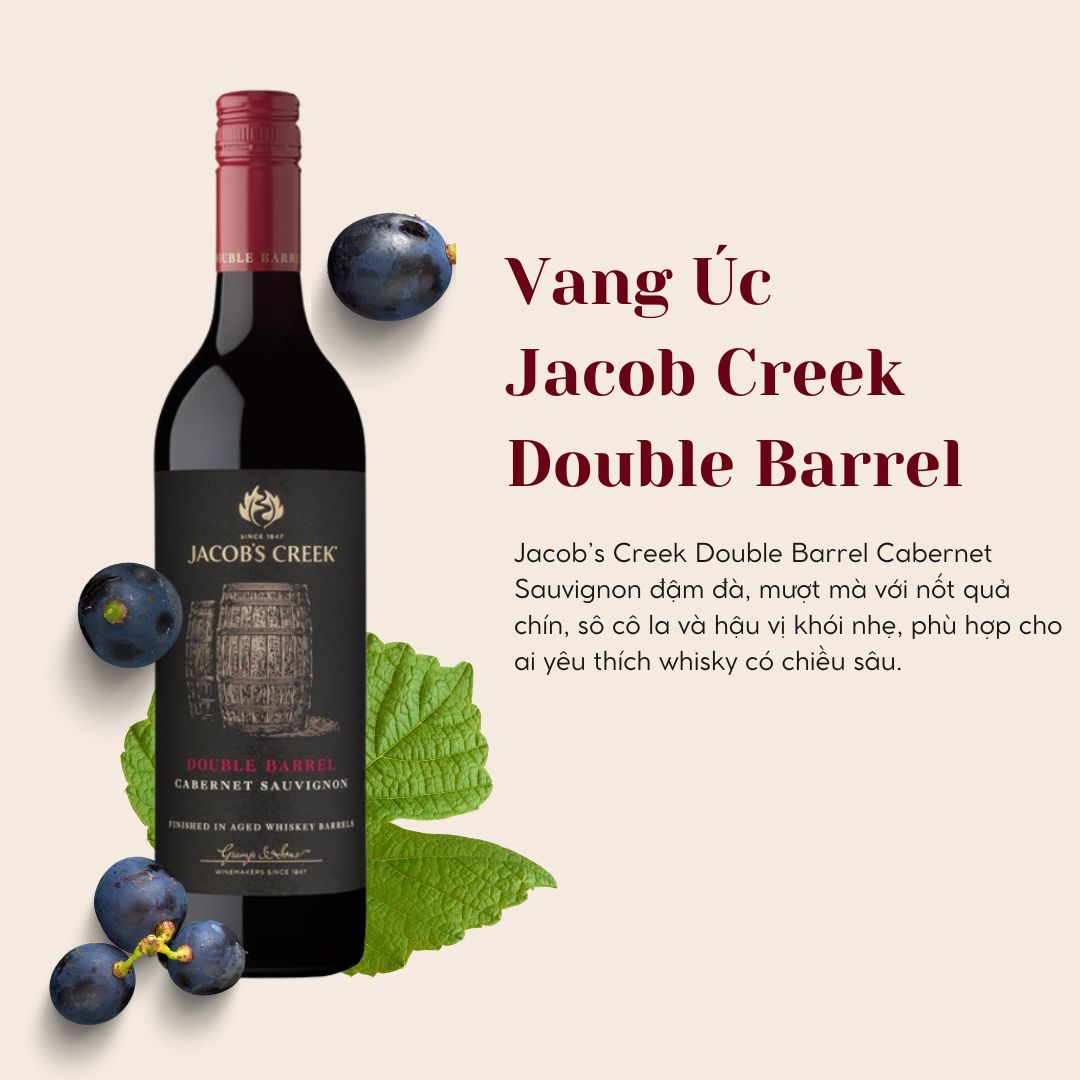 Jacob’s Creek Double Barrel Cabernet Sauvignon là một dòng rượu vang đỏ ngonđộc đáo từ Úc, nổi bật với quá trình ủ hai lần trong thùng gỗ sồi truyền thống và thùng whisky, giúp rượu có hương vị phong phú và kết cấu mượt mà hơn.
