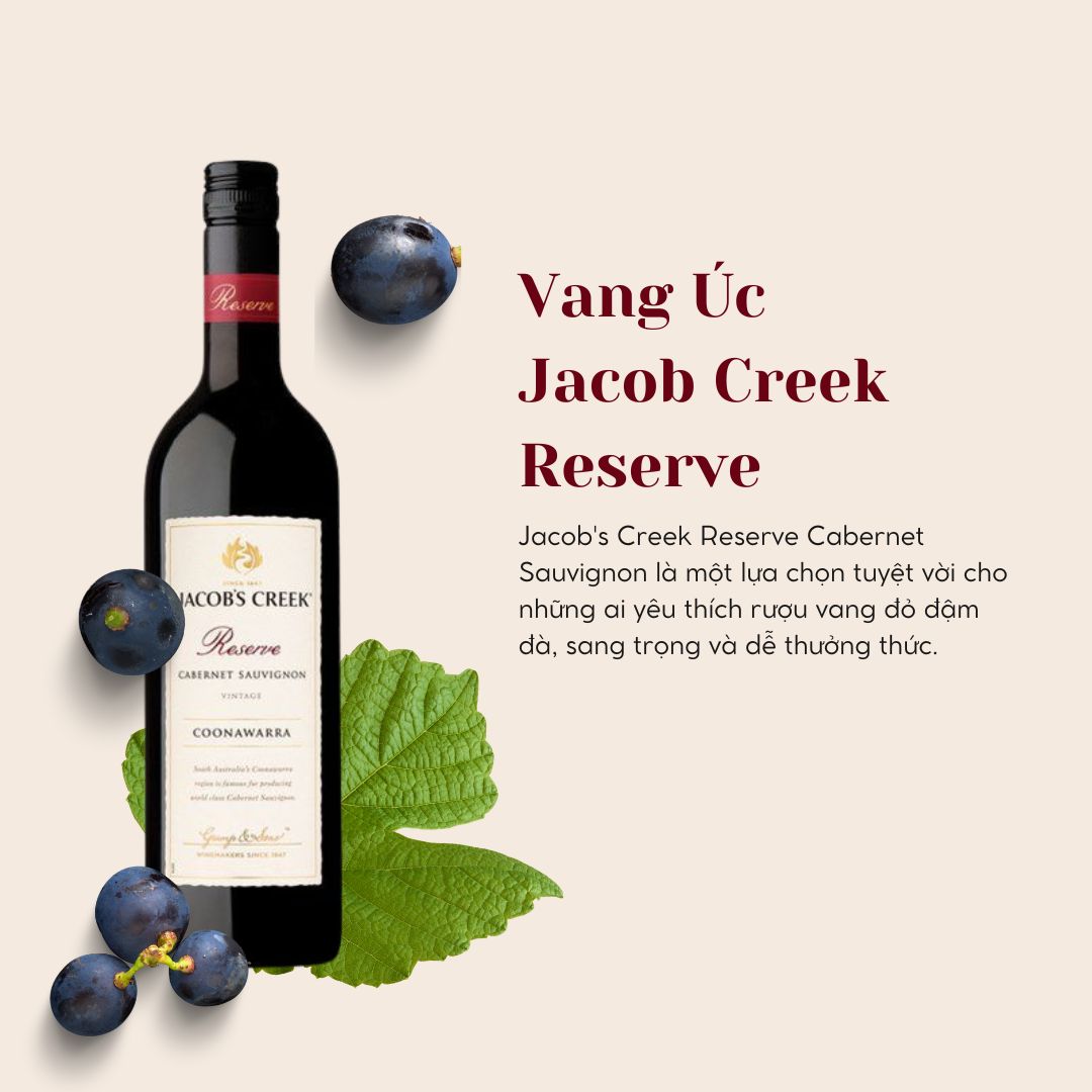 Jacob's Creek là một trong những thương hiệu rượu vang nổi tiếng lâu đời tại Úc, được thành lập từ năm 1847. Các sản phẩm của thương hiệu này luôn mang đến chất lượng vượt trội và được đánh giá cao trên toàn cầu. Dòng Reserve là một trong những bộ sưu tập đặc biệt, nhấn mạnh sự tinh tế và đẳng cấp của các chai rượu vang.
