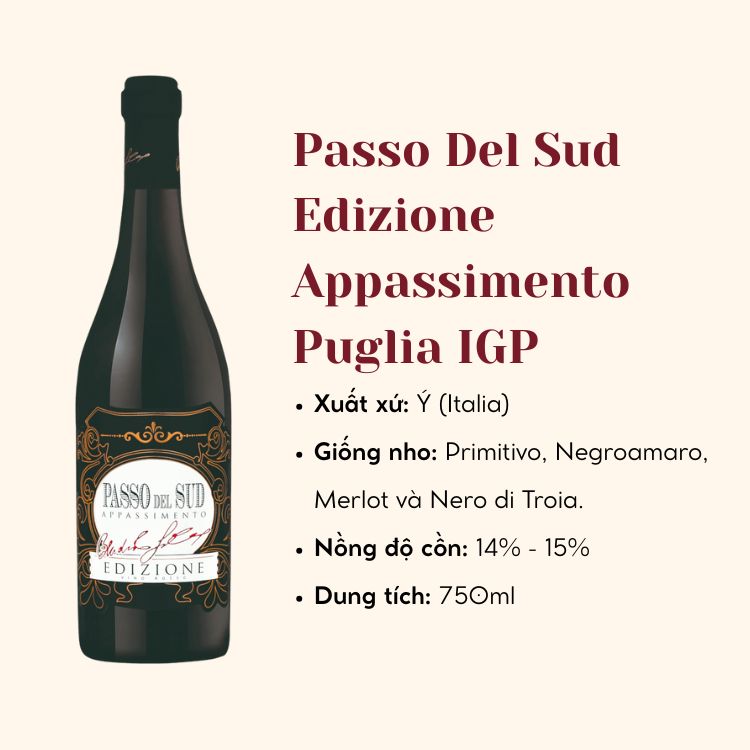 Phương pháp: Appassimento (Nho được phơi khô một phần trước khi làm rượu để tăng nồng độ đường và hương vị).