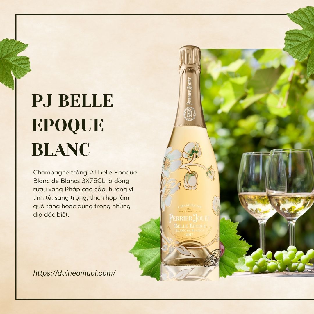 PJ Belle Epoque Blanc de Blancs là một trong những dòng Champagne trắng đặc biệt và cao cấp đến từ nhà sản xuất nổi tiếng Perrier-Jouët – thương hiệu lâu đời của Pháp, có mặt từ năm 1811. Dòng Champagne này được làm từ 100% nho Chardonnay – giống nho trắng quý hiếm, nổi tiếng với hương vị thanh thoát và tươi mới.