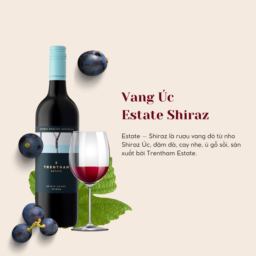 Estate – Shiraz là rượu vang đỏ từ nho Shiraz Úc, đậm đà, cay nhẹ, ủ gỗ sồi, sản xuất bởi Trentham Estate.