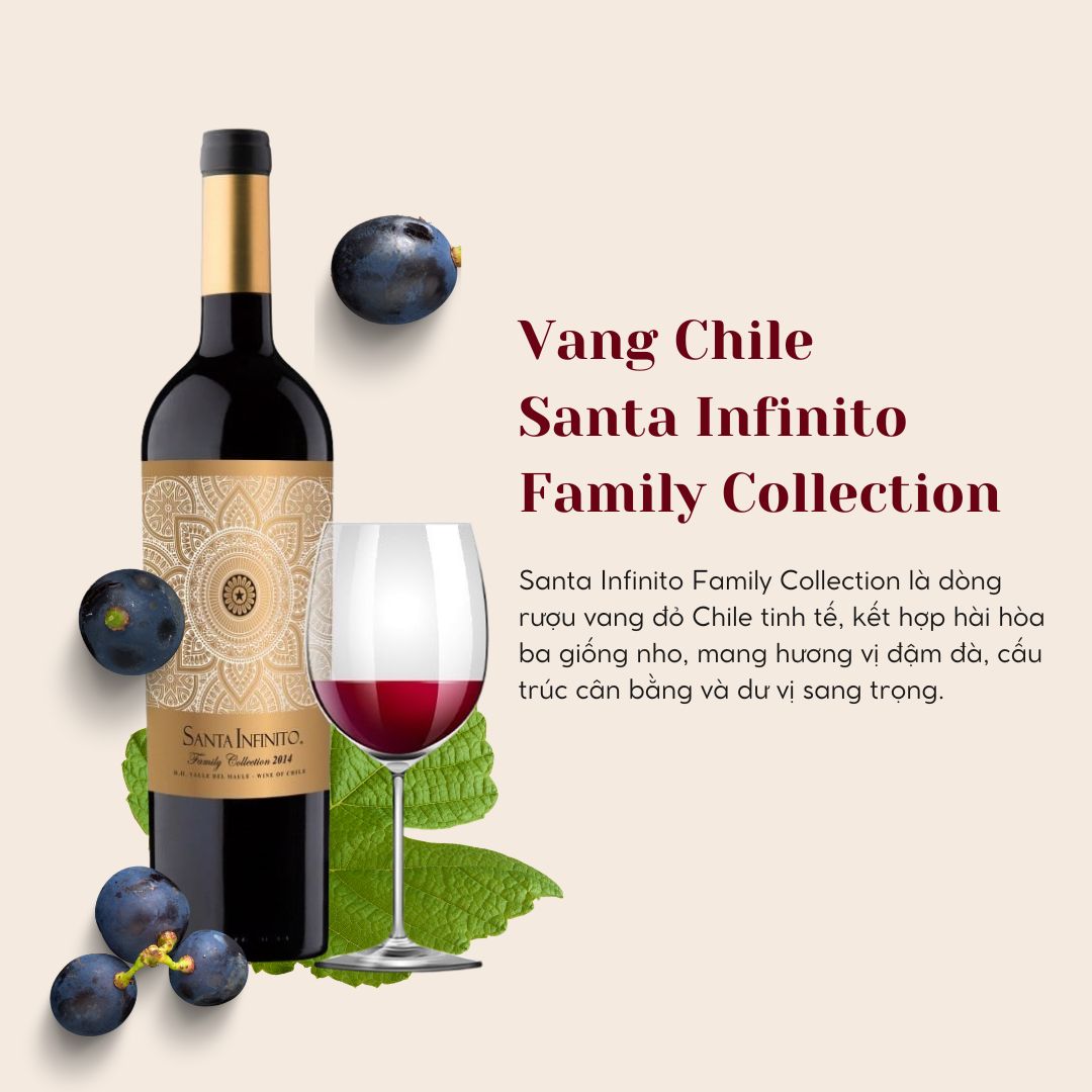 Santa Infinito Family Collection là dòng rượu vang đỏ Chile tinh tế, kết hợp hài hòa ba giống nho, mang hương vị đậm đà, cấu trúc cân bằng và dư vị sang trọng.